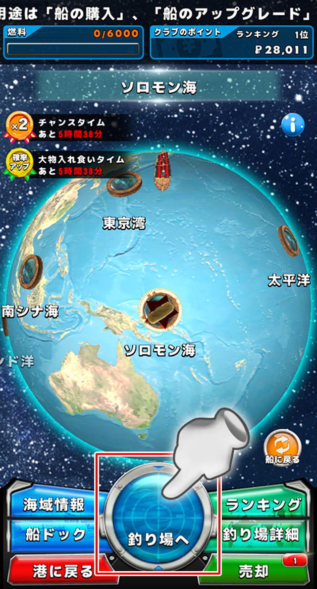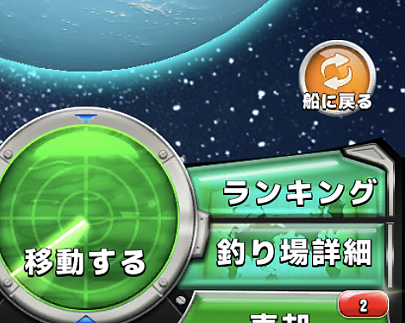 最初は日本でしか釣りが出来ないので、「釣り場へ」ボタンを押して釣り場へ移動します。