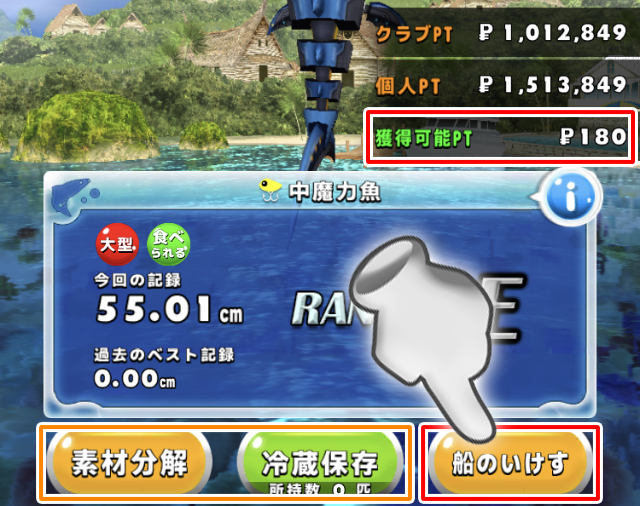「船のいけす」を選択すると、魚を一時的に保存できます。こちらはすぐに獲得可能PTは得られません。