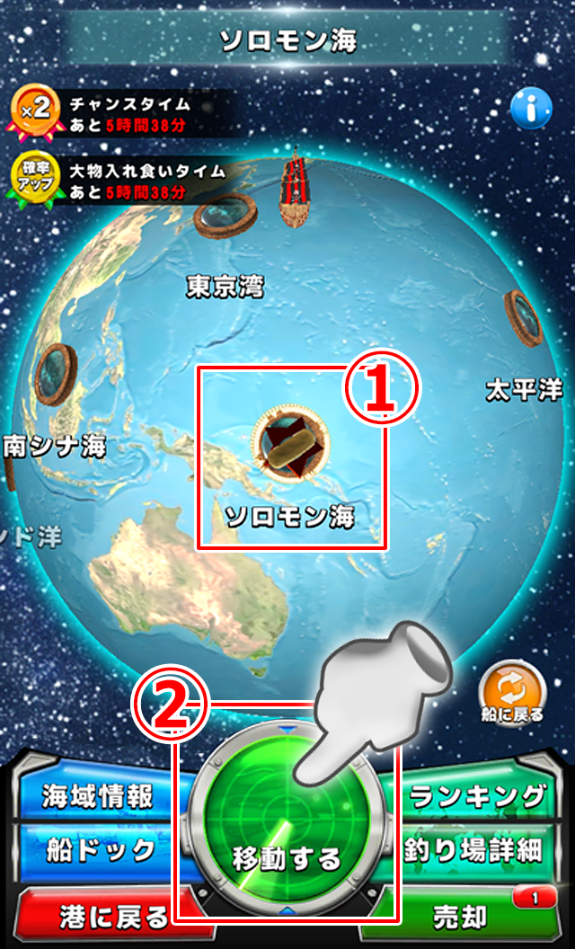 船に戻るボタンは停泊している海域の位置に戻ることができます。