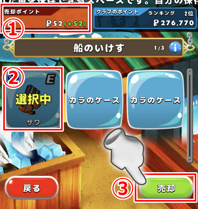 ①魚を選択すると画面左上に売却ポイントが表示されます。