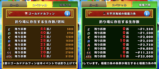 釣り場詳細を選択するとその海域の黒タイプ魚やゴールドドルフィンの残数を確認することが出来ます。